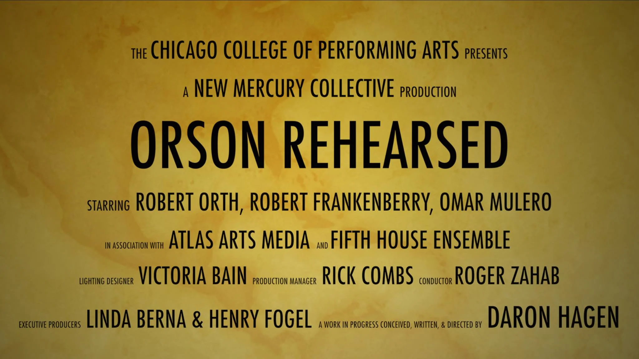 The Chicago College of Performing Arts presents ORSON REHEARSED, debuting in September 2018 at the Studebaker Theater in Chicago. A New Mercury Collective production conceived, composed, and directed by Daron Hagen starring Robert Orth, Robert Frankenberry, and Omar Mulero, and featuring the Fifth House Ensemble.